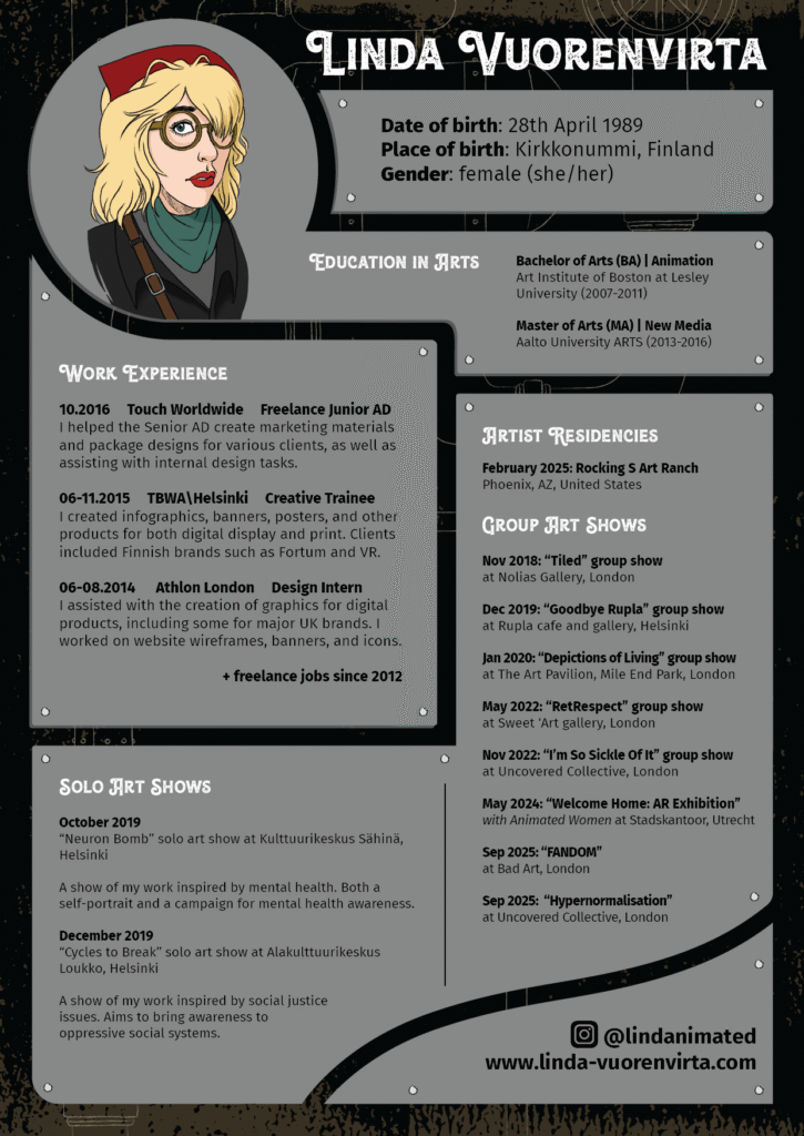 My media is often digital, but I also enjoy markers, acrylic paints, printmaking, and mixed media. I’ve studied fine art, animation, illustration, graphic design, and new media, which exposed me to this breadth of artmaking materials and techniques. I’ve taken on freelance jobs from international clients in various creative fields, contributing work to products including books, magazines, album covers, and music videos. I have a BA degree in animation and an MA degree in new media. I’ve exhibited in group shows in three countries, had solo shows here in Finland, and attended an international artist residency.